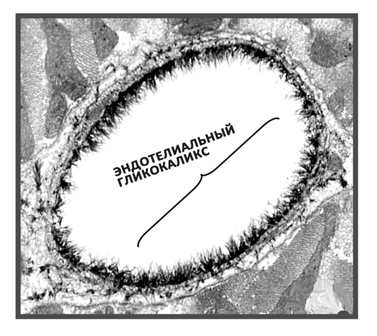 Рис. 1. На фото показан просвет сосуда, который в норме по контуру окружен гликокаликсом - эндотелиальными ворсинками, а при атеросклерозе он исчезает.
