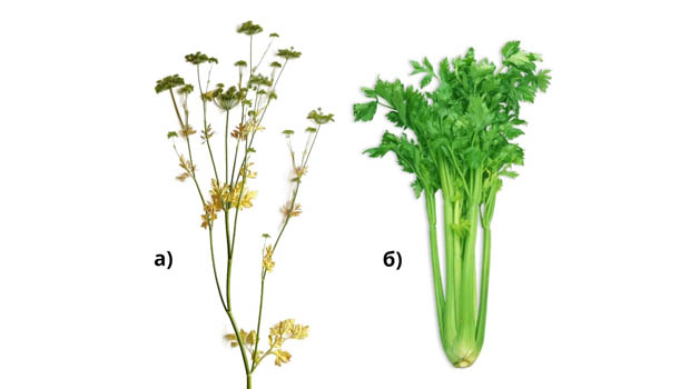 Рис. 11. На рис. видно: а) что переход растения сельдерей на второй год в стадию образования семян вызывает пожелтение и быстрое старение листьев, а затем отмирание; б) внешний вид растения на первый год жизни, когда не закладываются семена; имеет зелёный, молодой вид. Постоянное выщипывание семян (содержат гормон абсцизовую кислоту) переводит растение в 3-х, 4-х-летнее и т. д., сохраняет его неотеническую форму.