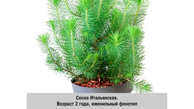 Рис. 6. На фото саженец сосны итальянской возрастом 2 года и имеющий выраженные особенности ювенильного фенотипа.