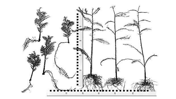 Рис. 1. Справа — внешний вид саженцев из укоренённых черенков от ювенильных ортотропных побегов, заготовленных в ювенильном маточнике, которые сохраняют все признаки ювенильного строения сеянцев и высокой степени к регенерации. Слева — укоренённые черенки от побегов, взятых в кроне. Автор обнаружил у секвойи важную особенность – легко закладывать обилие поросли в основании даже старых деревьев, которые отрастали из спящих почек, обладающих высшей степенью ювенильности и тотипотентностью, см. рис. 2.