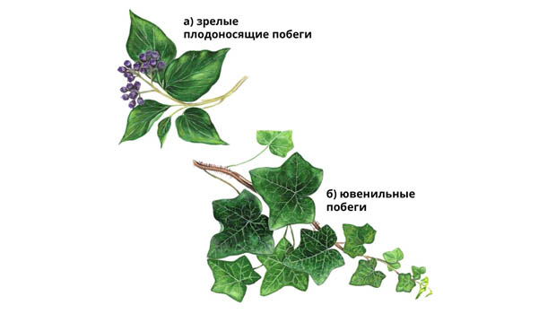 Рис. 10. а) взрослые плодоносящие побеги; б) ювенильные побеги плюща взятые с одного растения. Фактором переключения с ювенильности на зрелость является степень освещенности данной части растения, а также степень концентрации ауксинов, которая зависит от мощи апикальной почек и общей биомассы растения. От света зависит доминирование в апикальных почках гормона зрелости - ауксина или цитокинина – гормона ювенильности. Растение легко переключается на неотению и может поддерживать её не ограниченно.