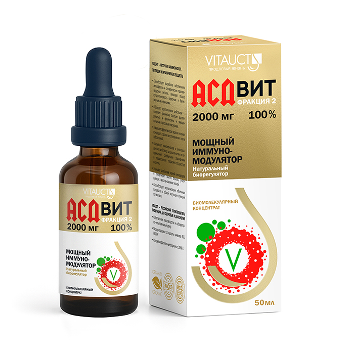 АСДвит от VITAUCT — первая субстанция антисептического стимулятора из свежего пищевого сырья для человека. АСДвит-2Ф превосходит ветеринарную 2-Ф благодаря содержанию уникальных активных компонентов, расширяющих фармакологическое действие. Он также отличается повышенной степенью очистки и полностью сохраняет все активные вещества ветеринарной 2-Ф, обеспечивающие её биологическую активность. При этом содержание этих ключевых компонентов в АСДвит-2Ф значительно выше — от 1,5 до 2,5 раз, что усиливает его эффективность.
